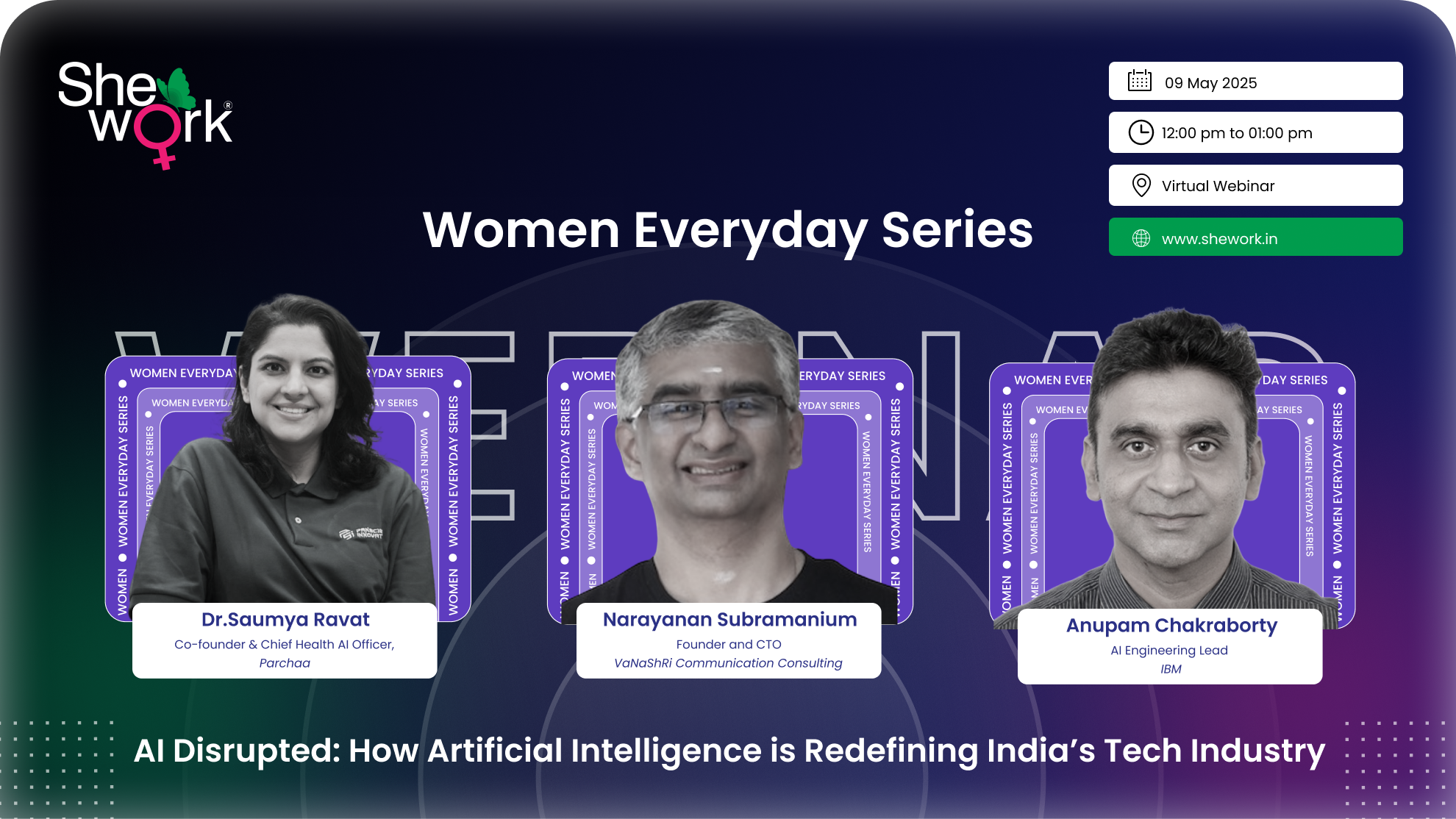 Women Everyday Series is a high-impact webinar series by SheWork spotlighting India’s top voices in tech and leadership. Each session features powerful conversations with industry leaders on AI, cybersecurity, digital innovation, and more. It’s where real stories meet real solutions—driven by women shaping the future of work and technology. Join us for bold ideas, expert insights, and practical takeaways you can act on.
