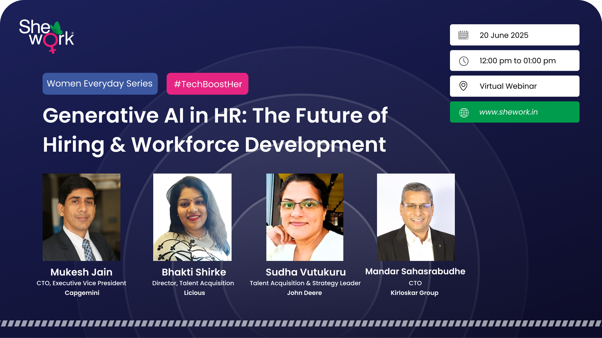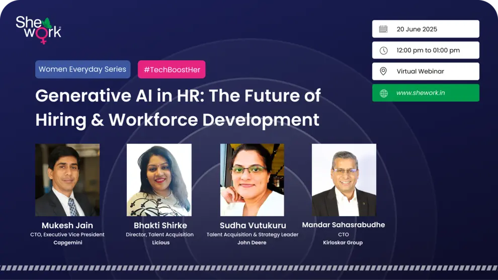 SheWork’s Women Everyday series brings you an exclusive session—“Generative AI in HR: The Future of Hiring & Workforce Development”—unpacking how AI is reshaping hiring strategies, upskilling journeys, and career paths for women in tech. From smarter recruitment tools to inclusive workforce development, discover what’s next in the world of work.