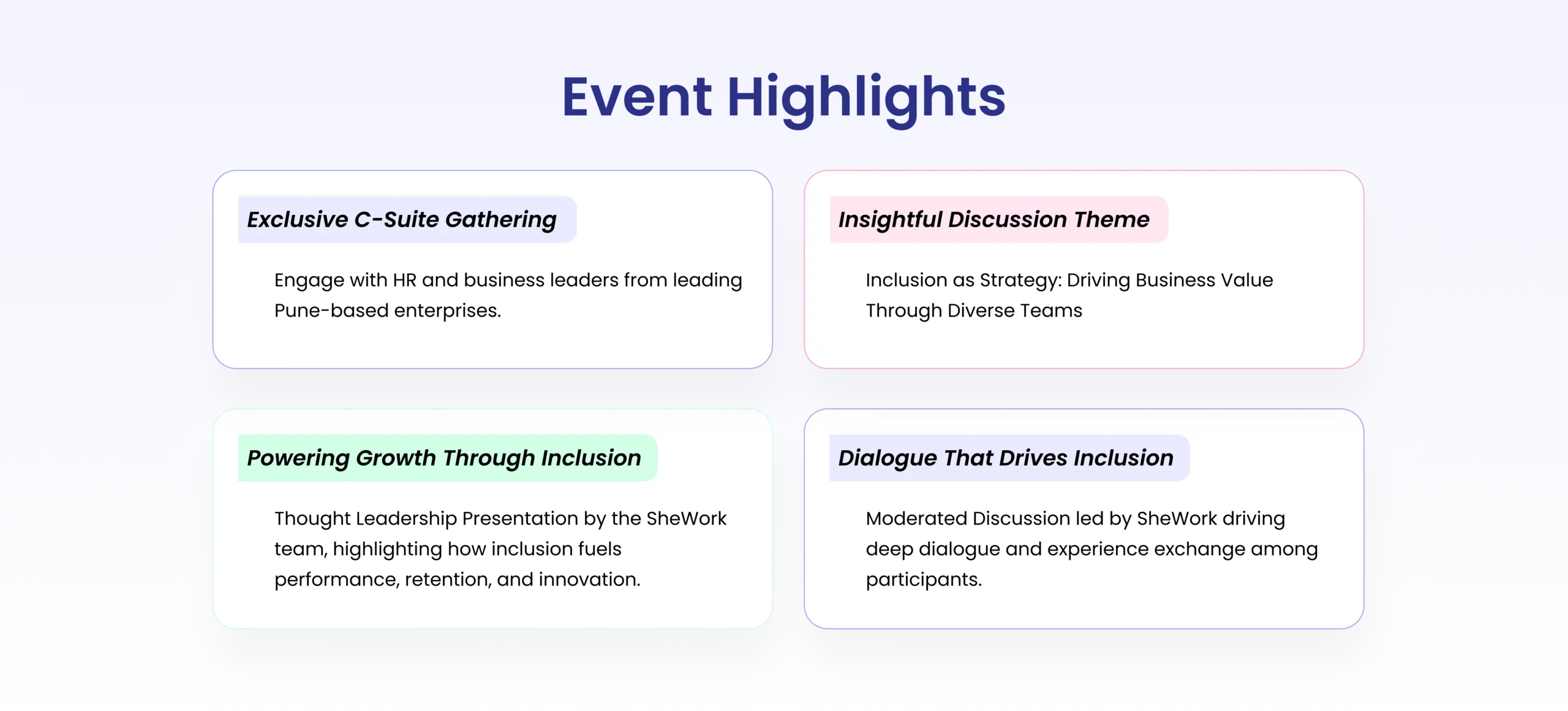 The SheWork Roundtable in Pune brings together top HR and business leaders to explore how inclusion and diversity can become core business strategies driving innovation, engagement, and long-term success. This exclusive, invite-only session is designed for CHROs, CXOs, and senior HR leaders who are shaping the future of workforce culture and inclusion across industries.