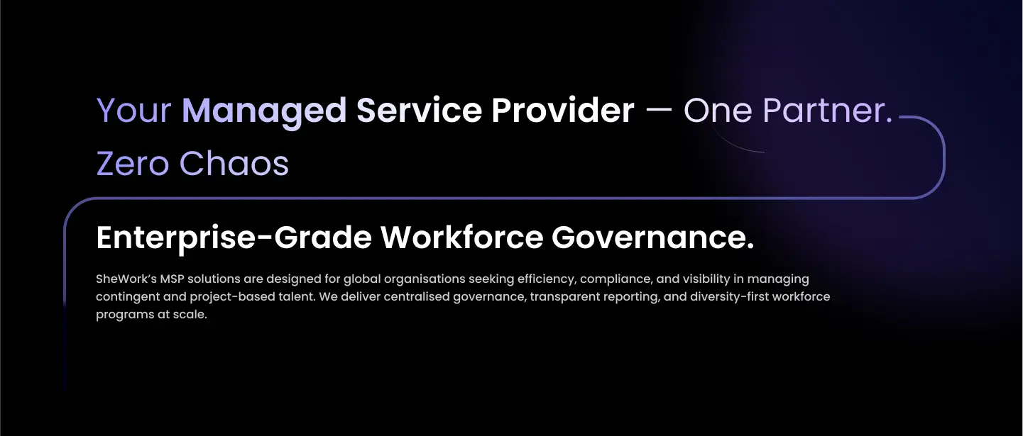 SheWork’s MSP solutions are designed for global organisations seeking efficiency, compliance, and visibility in managing contingent and project-based talent. We deliver centralised governance, transparent reporting, and diversity-first workforce programs at scale.